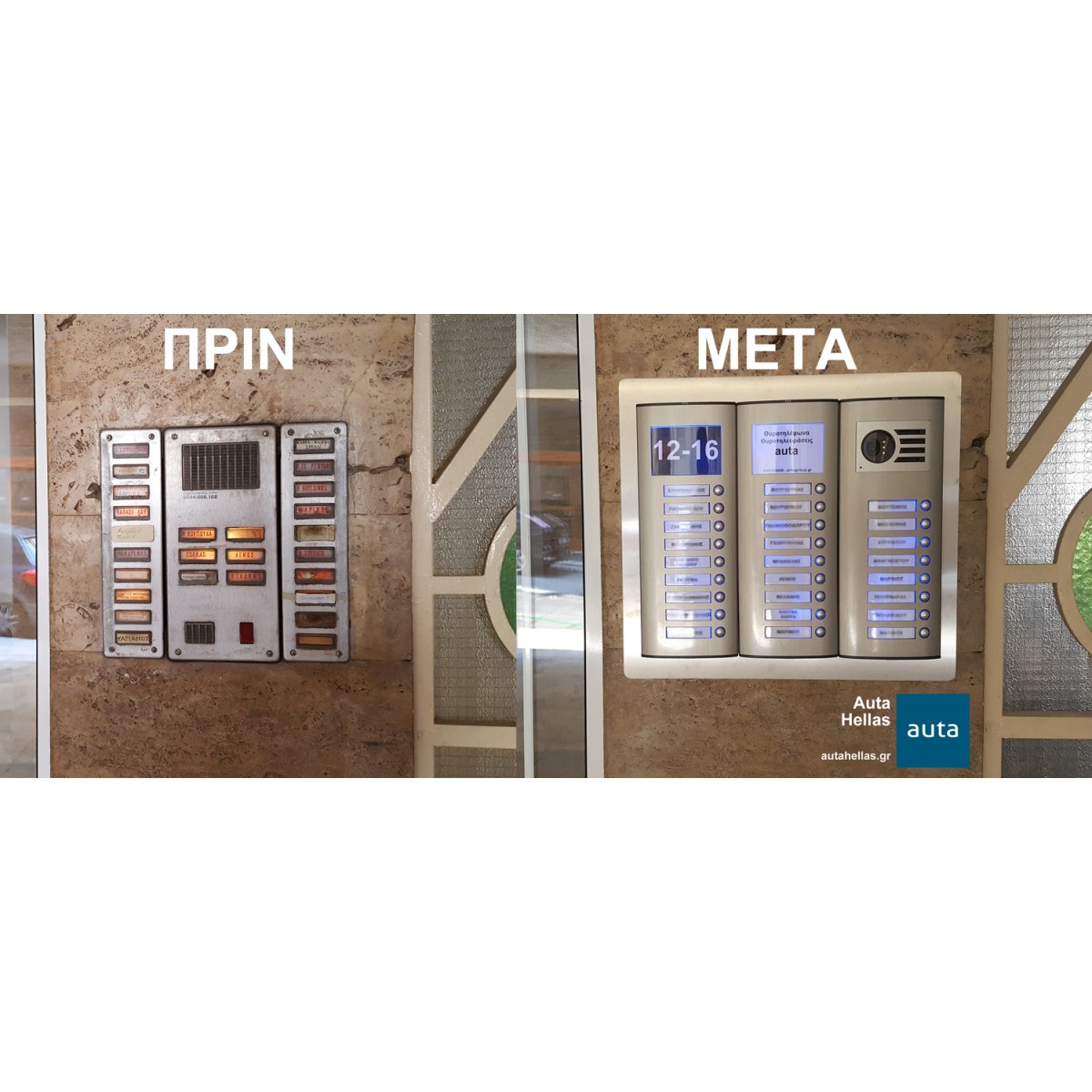 Το σύστημα VISUALTECH της AUTA αποτελεί καινοτομία για τέτοιου είδους εγκαταστάσεις, καθώς η μπουτονιέρα και οι οθόνες περιέχουν ψηφιακούς ενισχυτές σήματος και διατάξεις απόσβεσης παρεμβολών, παρέχοντας με αυτό τον τρόπο την μέγιστη απόδοση σε παλαιά δίκτυα καλωδιώσεων.